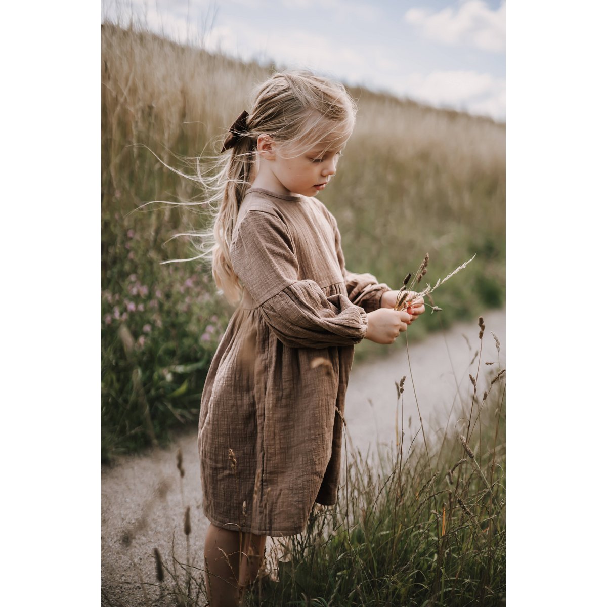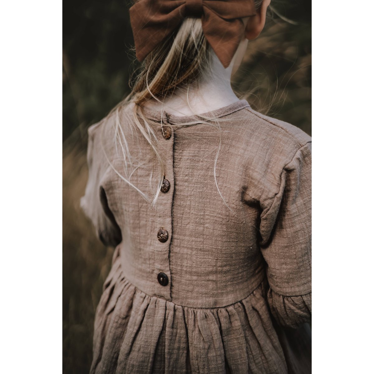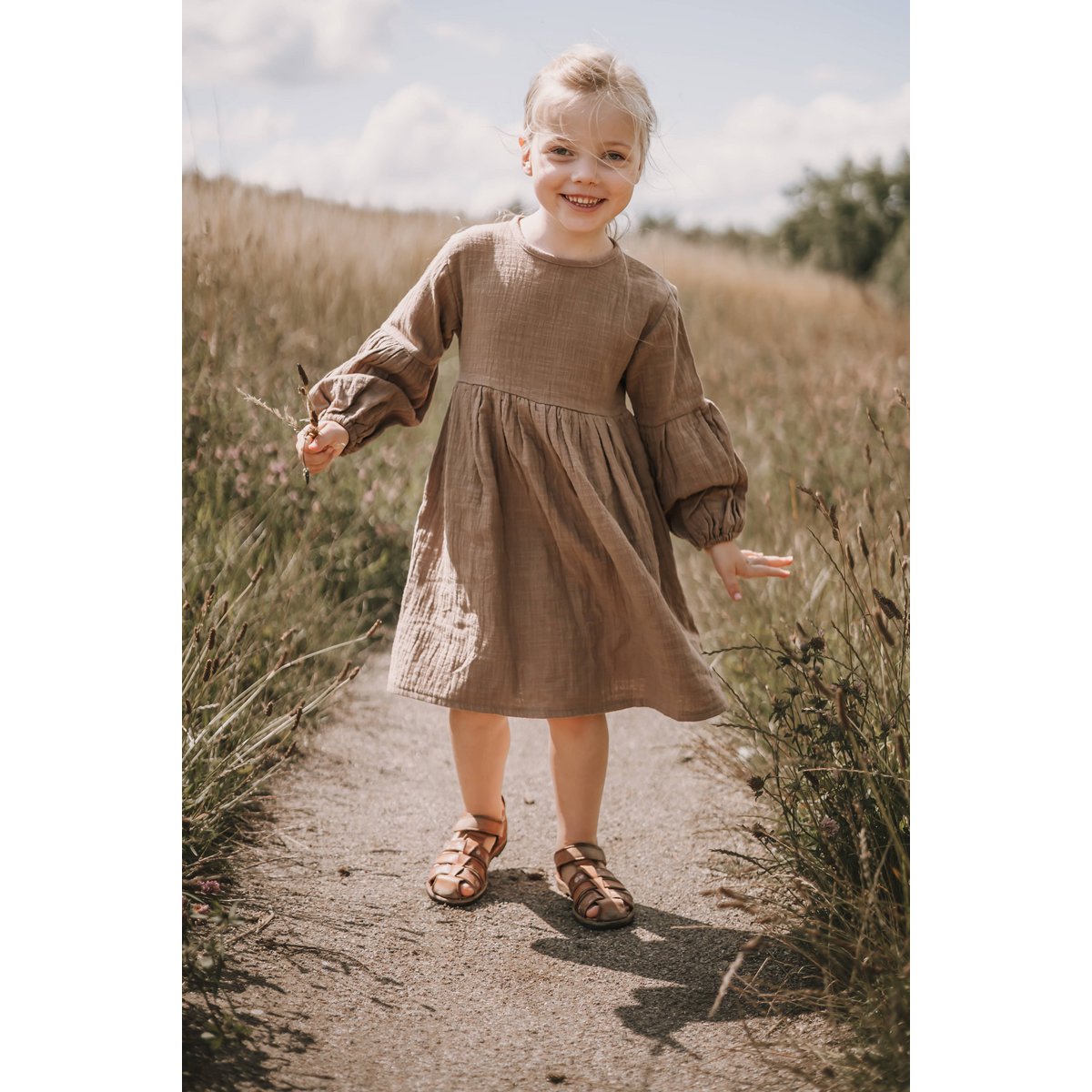 Entzückendes Kleidchen aus Bio-Baumwolle in zwei verschiedenen erdtönen erhältlich.