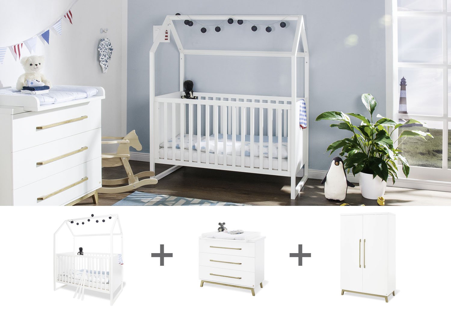 • 3-teiliges Set mit Hausbett 'Hilda', weiß, breiter Wickelkommode 'Riva' und 2-türigem Kleiderschrank 'Riva'
