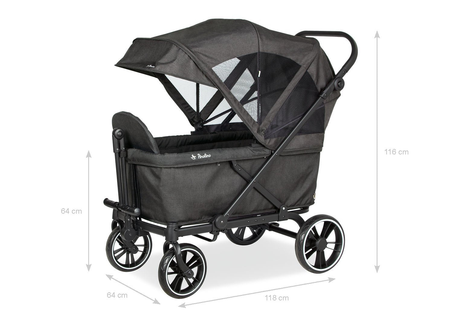- Abmessungen und Design: Der Bollerwagen misst L 116 cm x B 64 cm x H 116 cm mit einem faltbaren Schiebedach für UV-Schutz. Die kompakten Klappmaße (L 112 cm x B 58 cm x H 33 cm) erleichtern Transport und Lagerung.