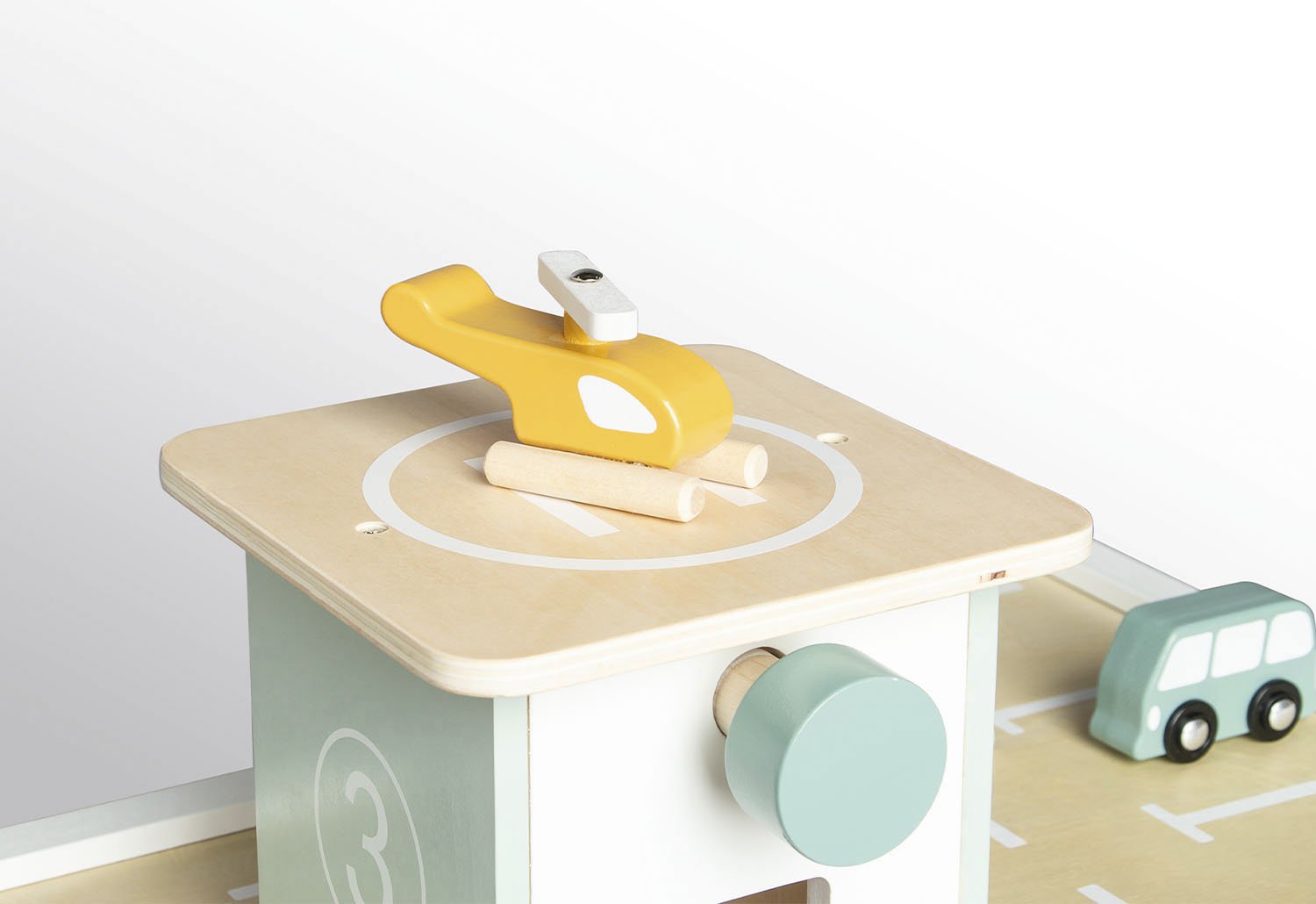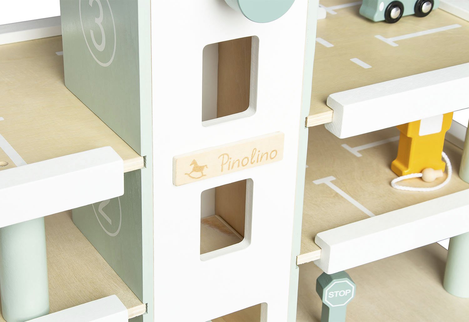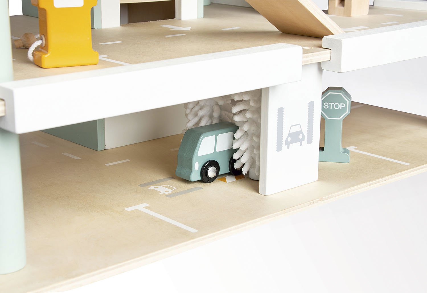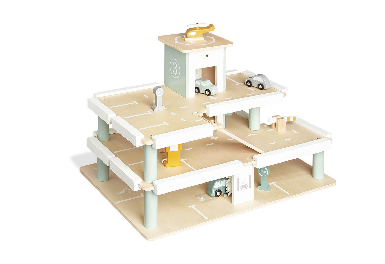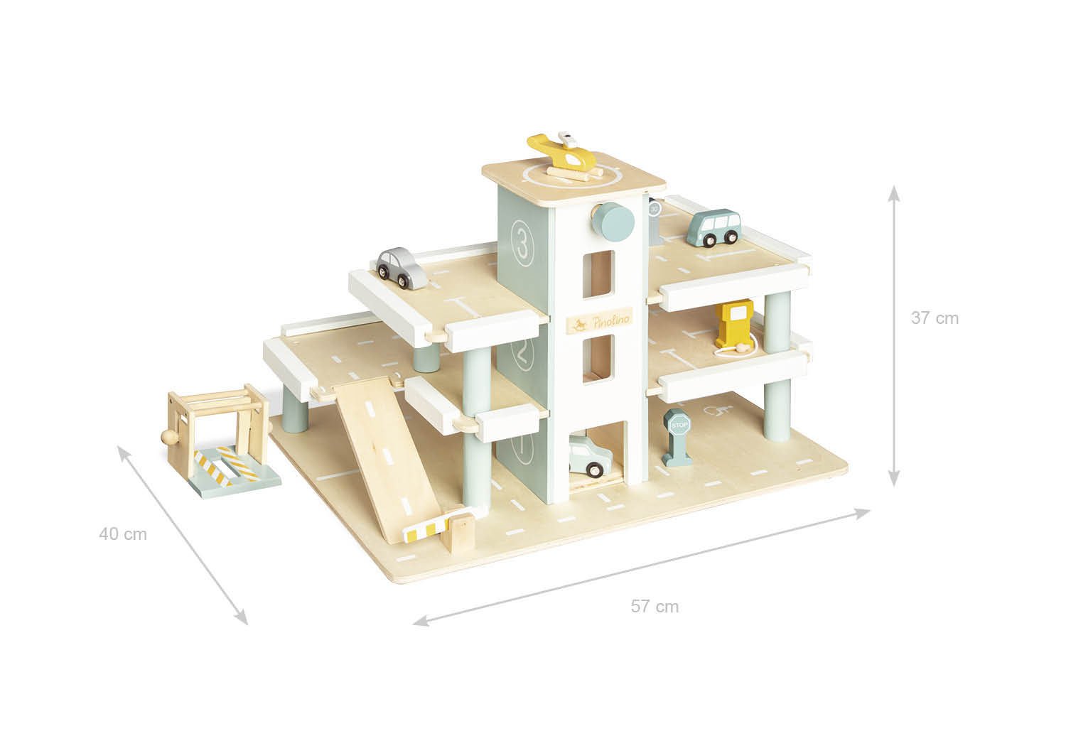 • 10 Teile: 1 Parkgarage, 4 Fahrzeuge, 5-teiliges Zubehör