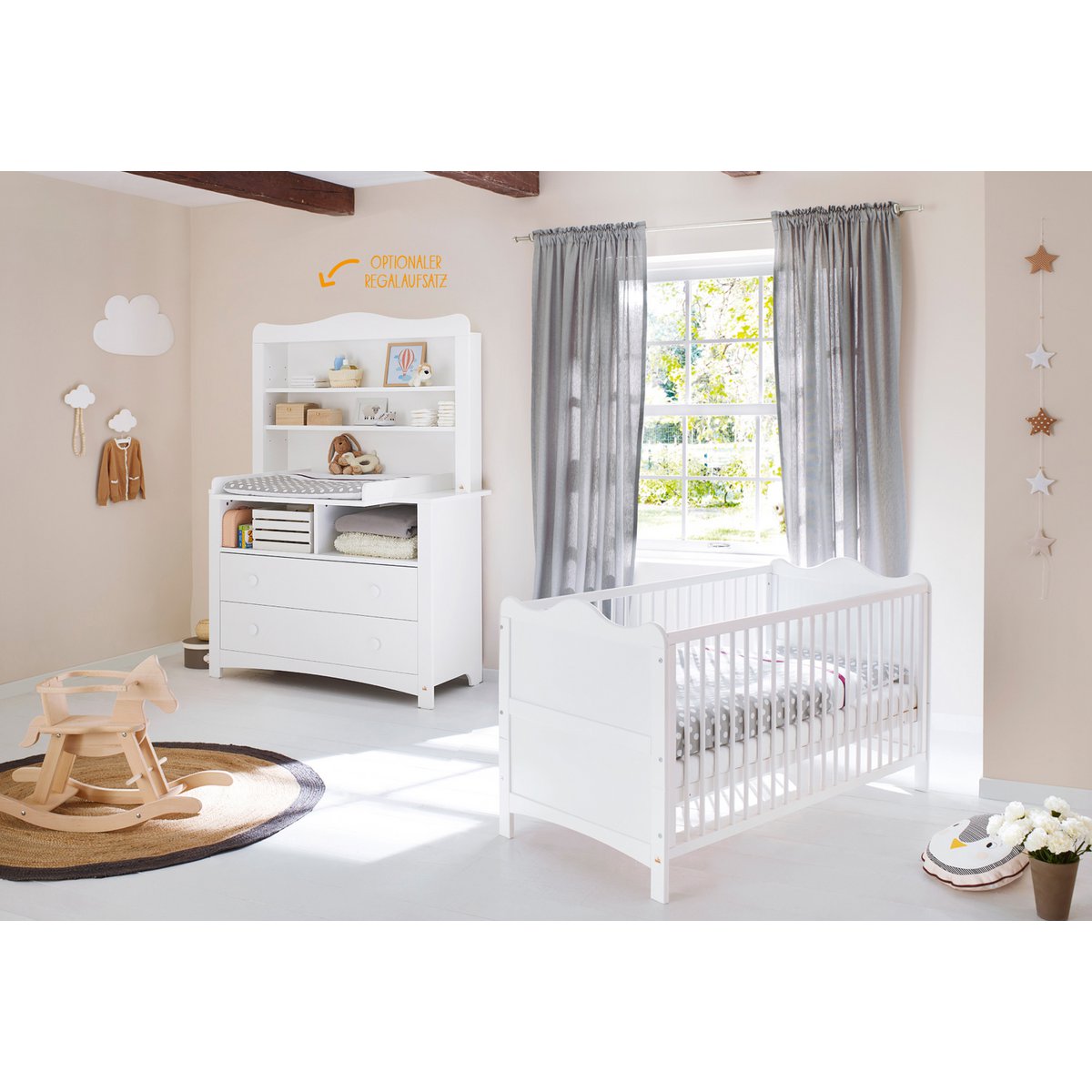• 3-teiliges Set mit Babybett und extra breiter Wickelkommode inkl. Regaleinheit