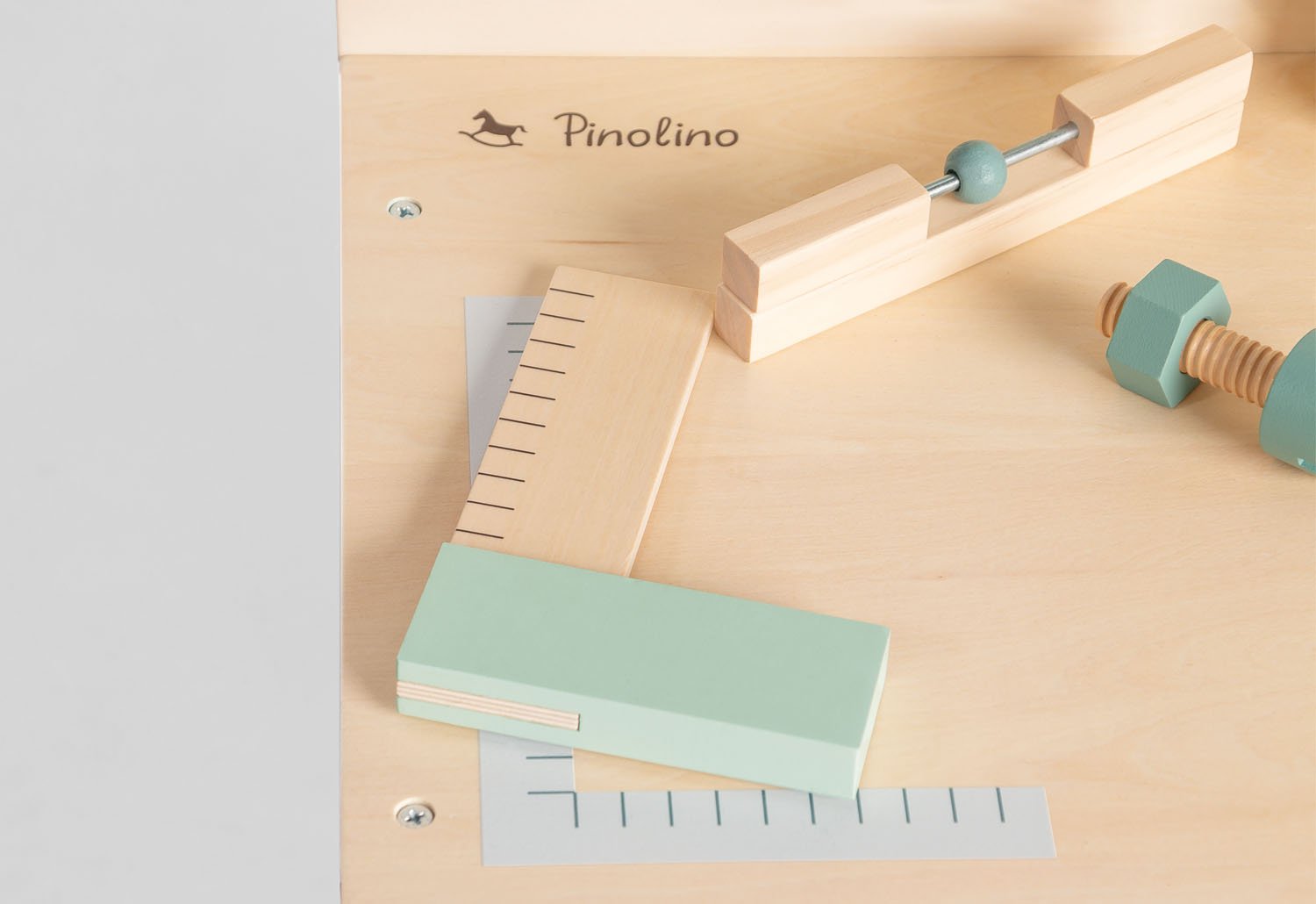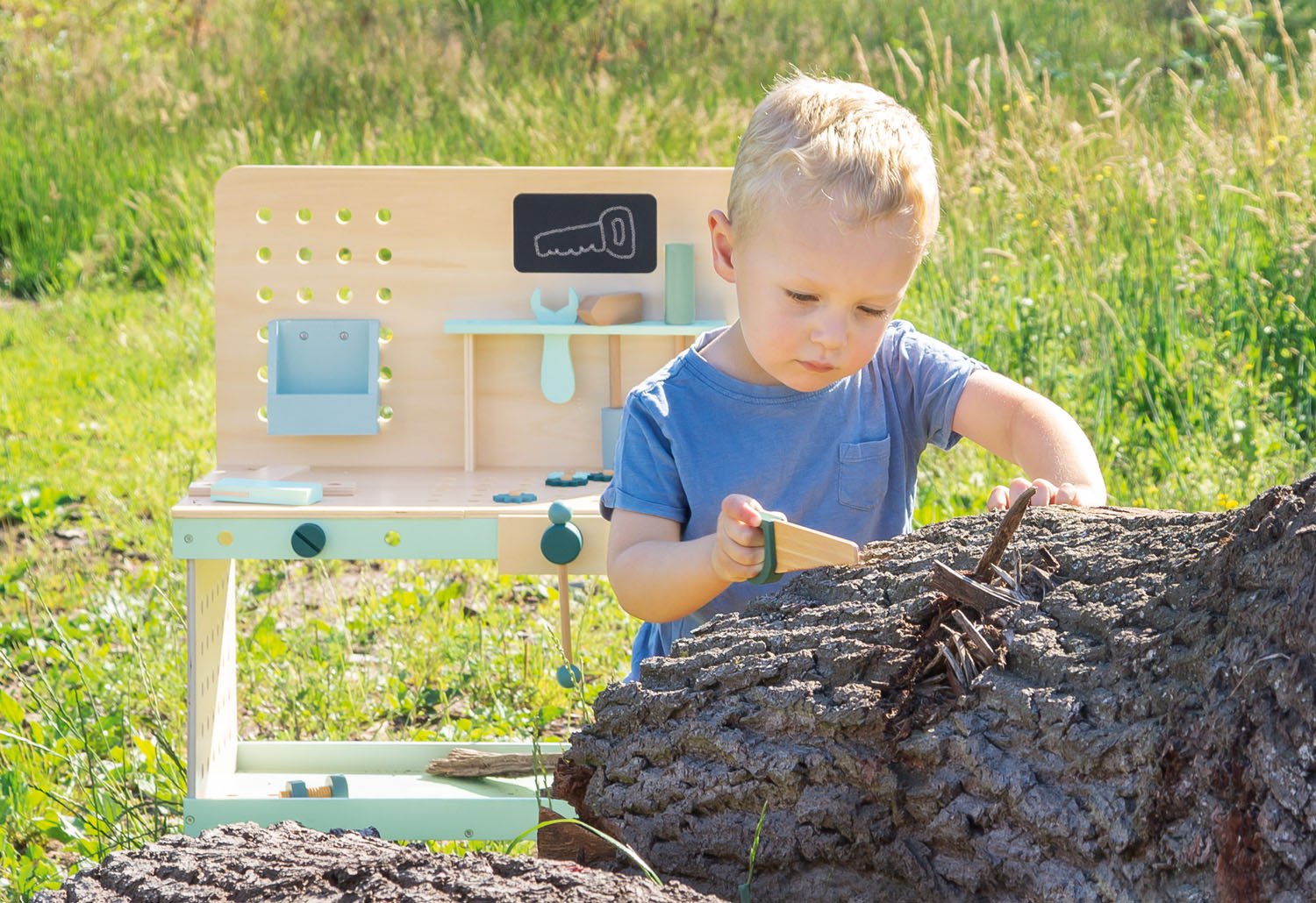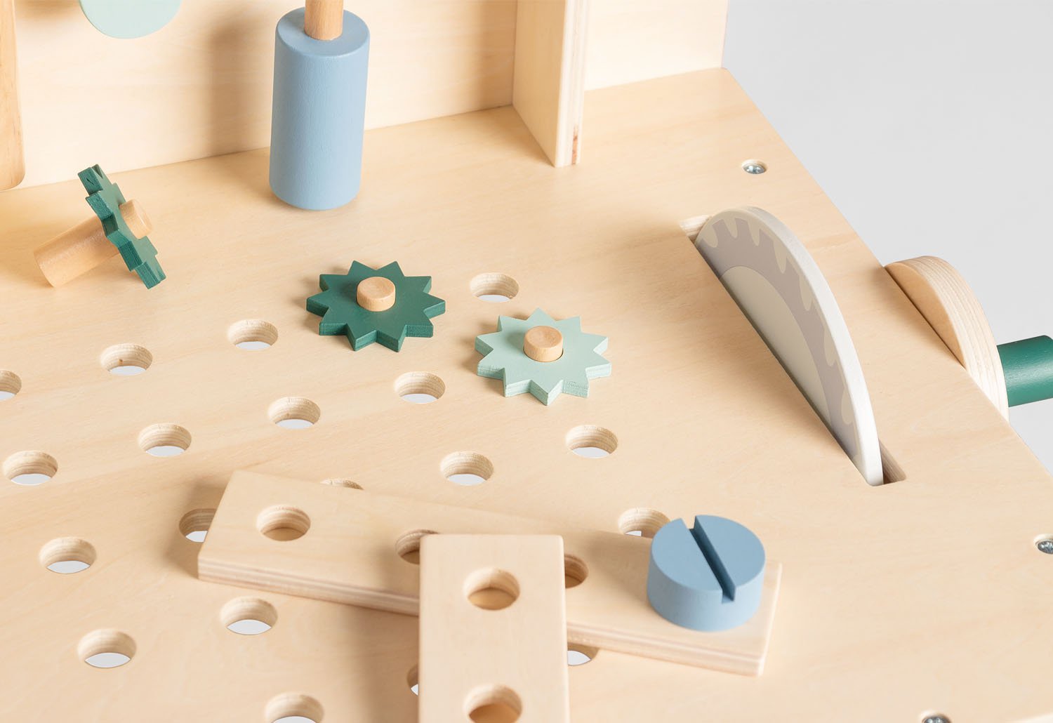 • 26-teilig: 1 Werkbank, 1 variabel steckbare Aufbewahrungsbox, 6-teiliges Werkzeug, 18-teiliges Zubehör